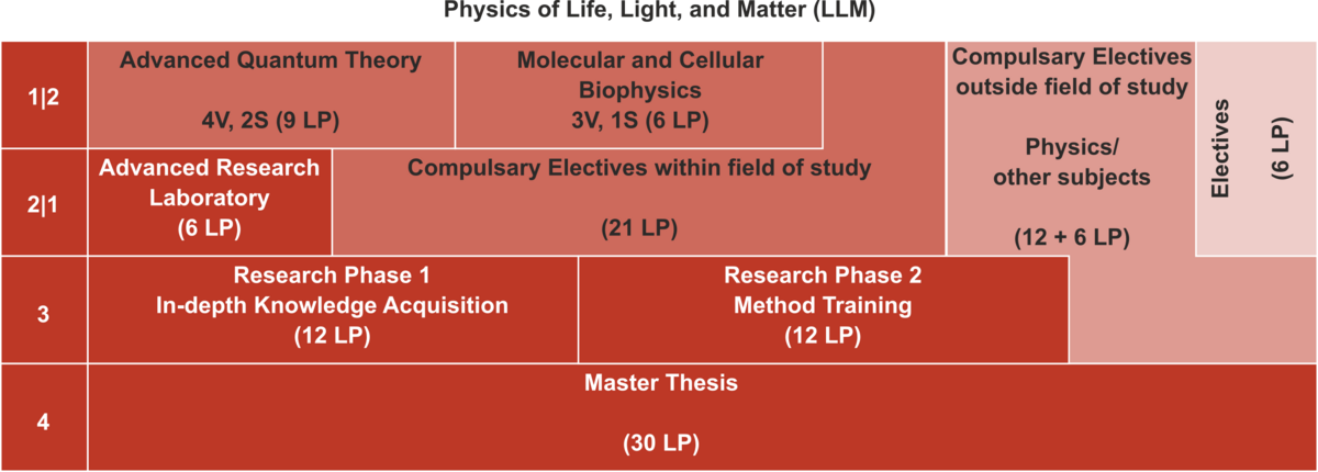 Die Studienrichtung „Physics of Life, Light, and Matter“ behandelt Themen der Physik, die für diese interdisziplinären Aufgabenstellungen von besonderer Bedeutung sind. Dies umfasst die Physik von Molekülen, Nanostrukturen und Oberflächen. Anwendungen sind, z. B., die Untersuchung der Zelladhäsion, die Nutzung von Quanteneffekten in der Bio-Sensorik, die Physik von Biomolekülen und Zellen, sowie moderne Methoden der Spektroskopie und der Mikroskopie mit Auflösungen bis zu atomaren Längenskalen.